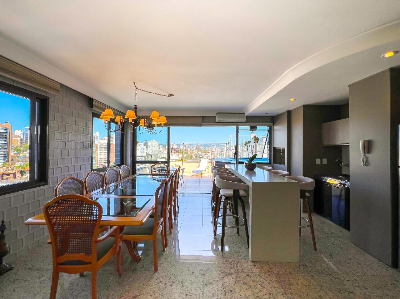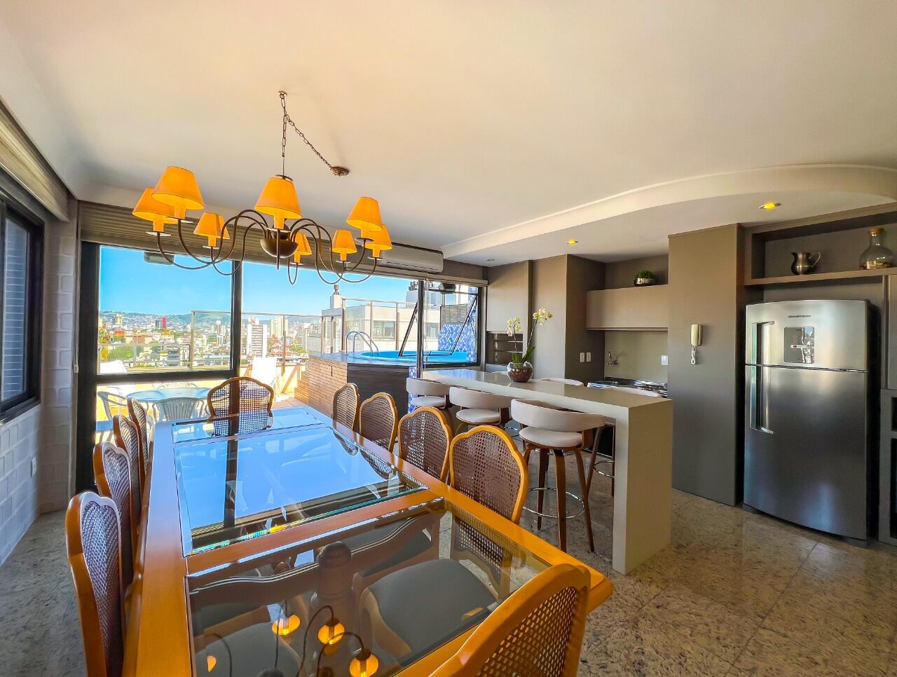 São 408m² totais e 290m² privativos, 3 dormitório sendo 2 deles suíte. Terraço fechado e terraço aberto com deck com piscina.