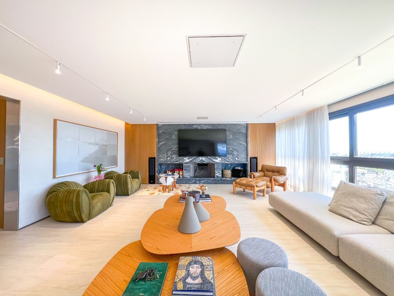 O amplo living com lareira, projetor, sistema de som e vista deslumbrante integra-se à sala de jantar e ao espaço gourmet com ilha em mármore, bar, adega e churrasqueira. A sacada de 19m², com jacuzzi e segunda churrasqueira, amplia a experiência de lazer privativo.