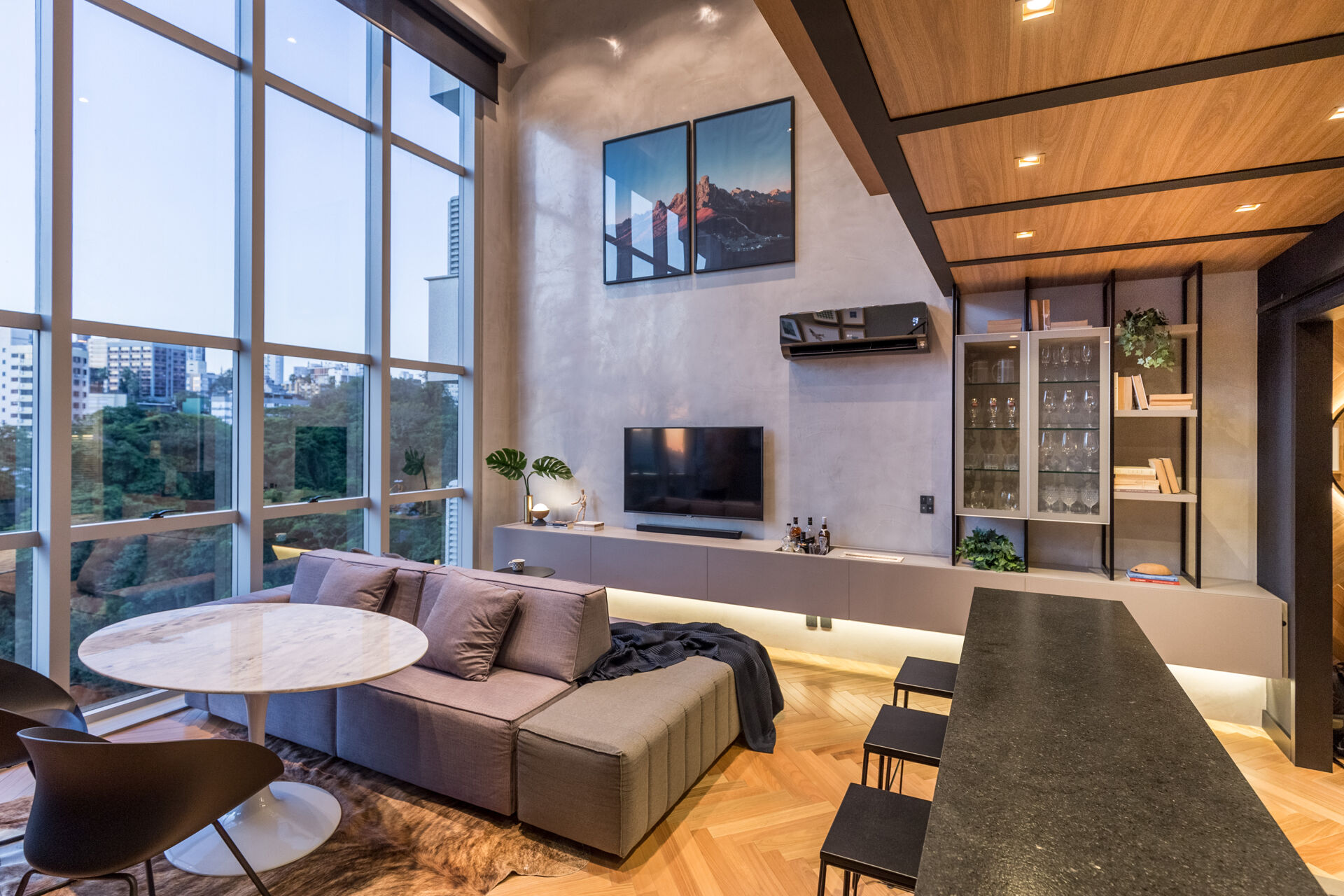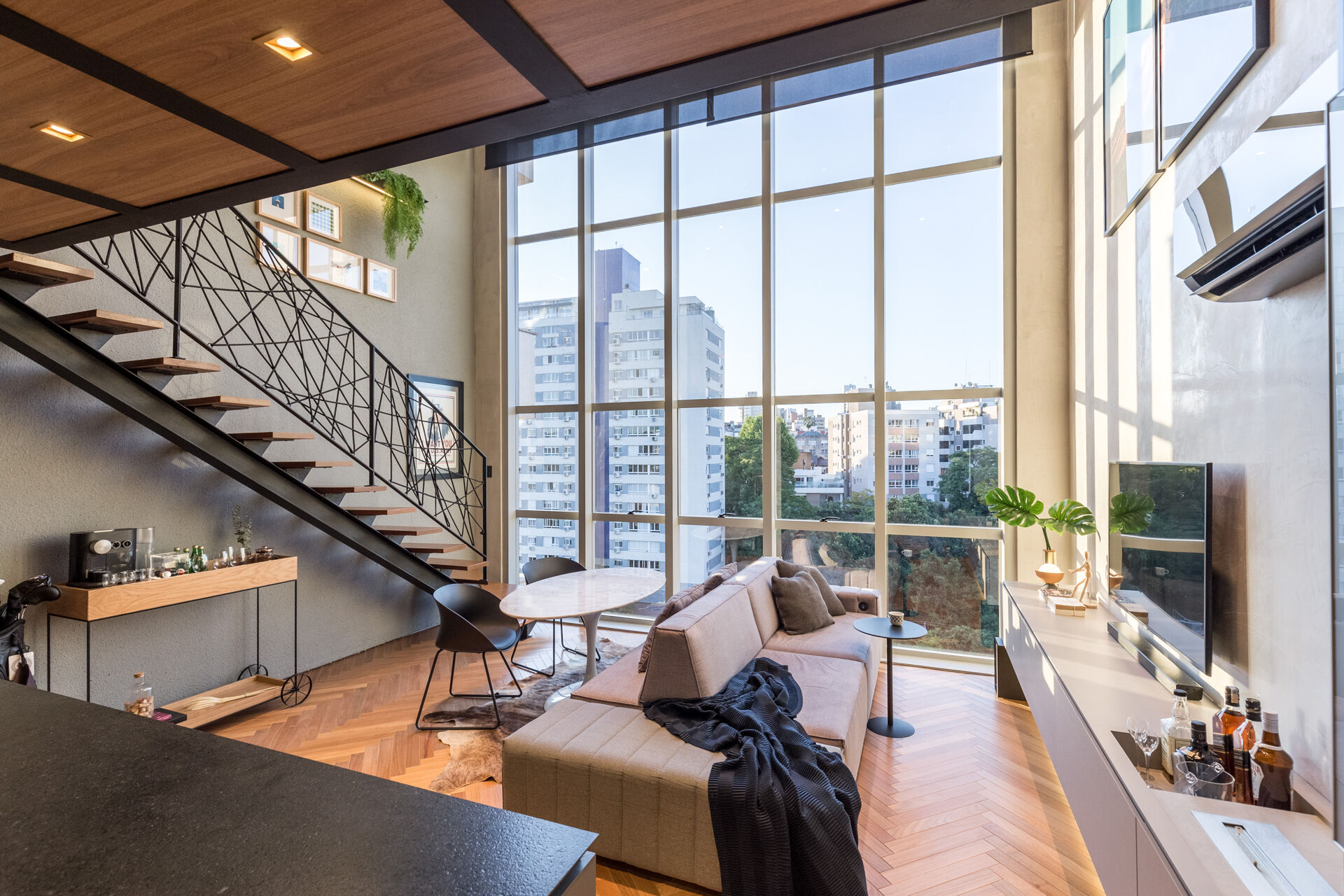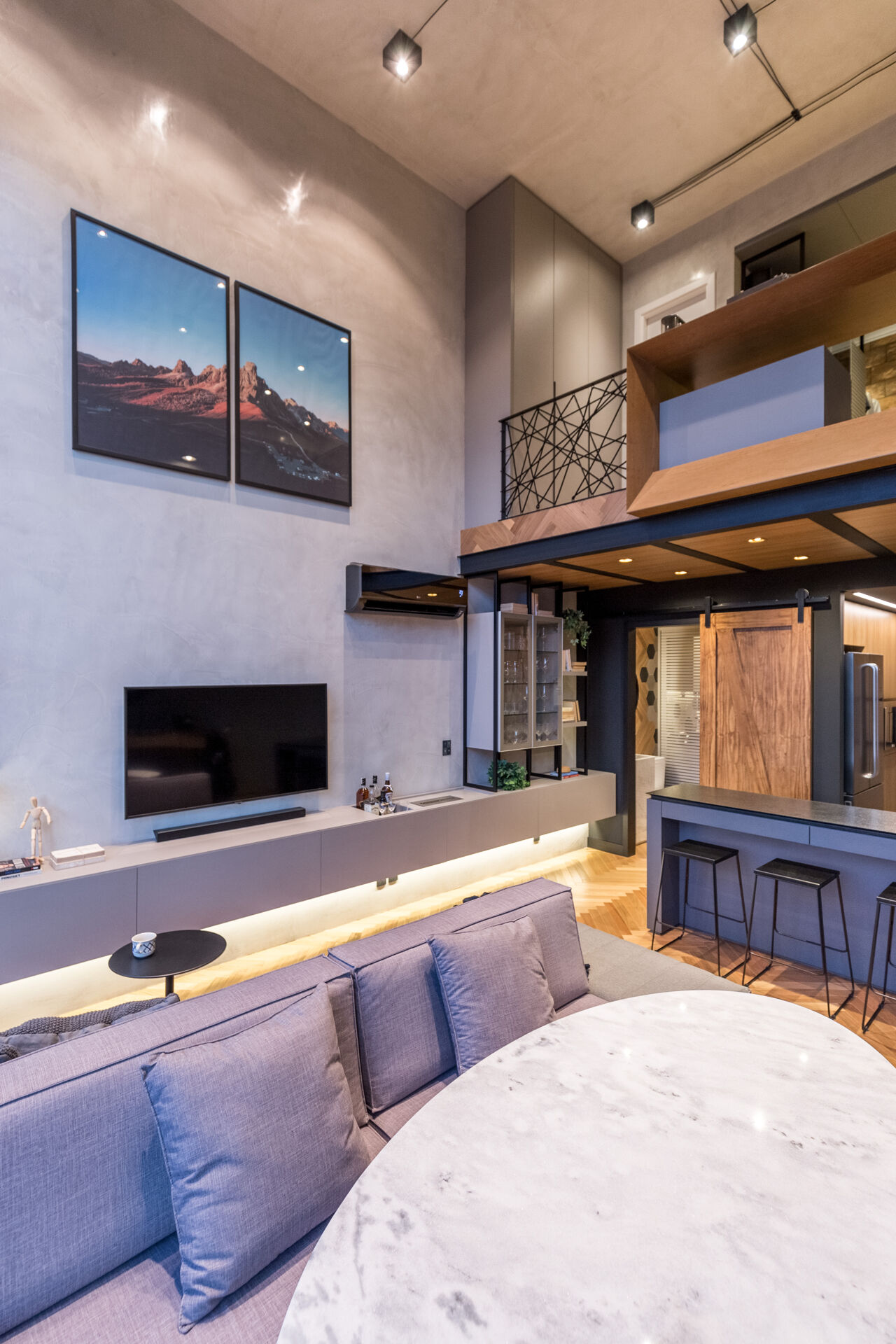 Apartamento duplex de 77 m², com projeto assinado por escritório de arquitetura e publicado na Casa Cor Brasil. O living com pé-direito duplo organiza-se em três ambientes, com piso de madeira em espinha de peixe. A bancada gourmet integra-se à cozinha que possui churrasqueira, complementada por lavabo e área de serviço planejada. No pavimento superior, uma suíte com mesa de home office em madeira maciça feita sob medida. O apartamento conta com automação Alexa, marcenaria de alto padrão e cortinas blackout. Duas vagas de garagem.