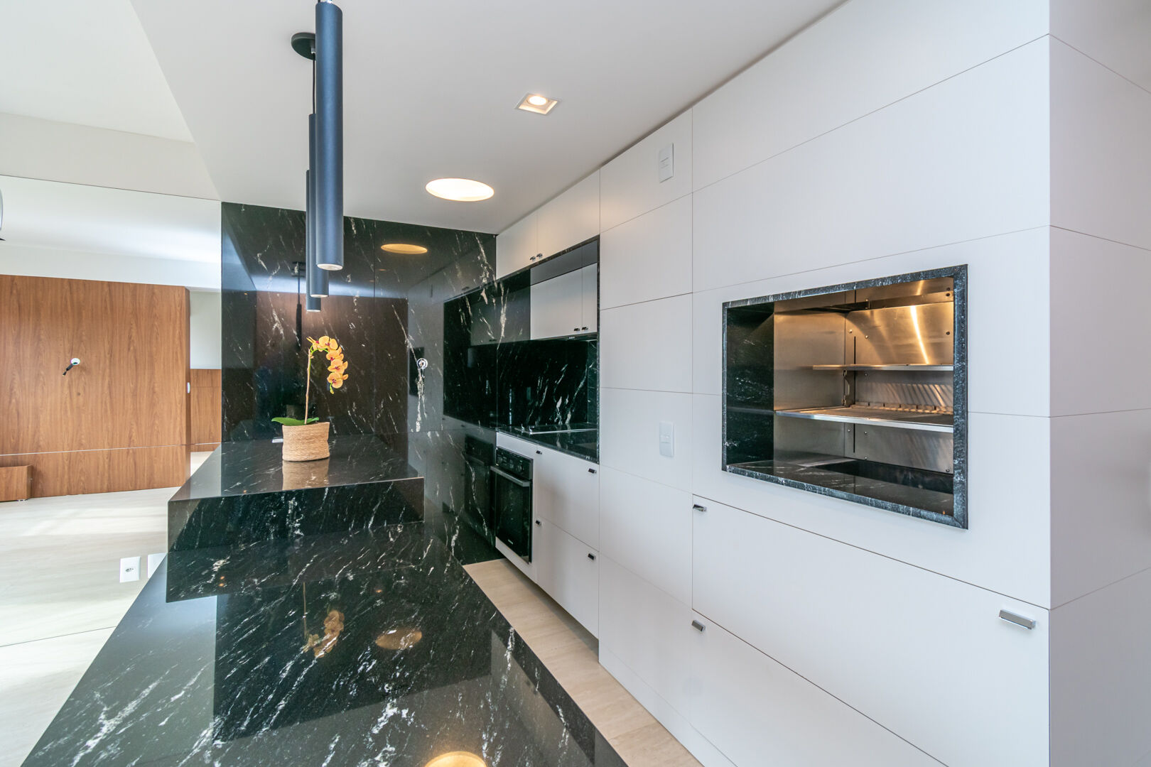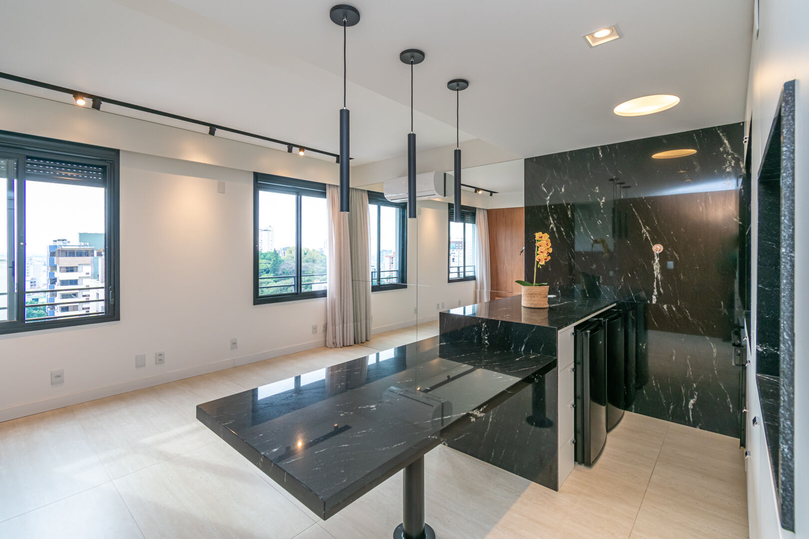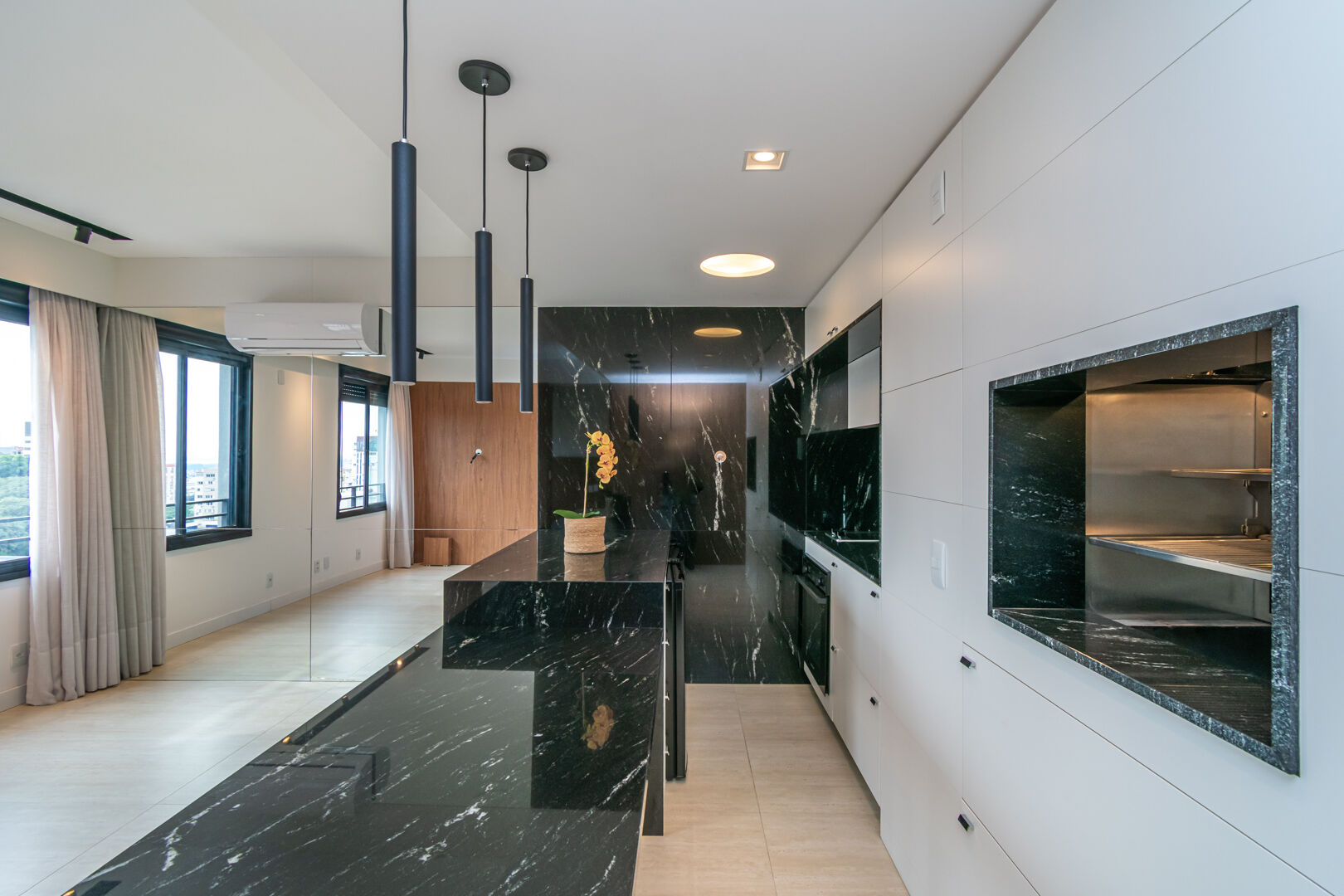 Ele conta com um linving integrado com a cozinha amareicana, já com ar condicionado, moveis e elestros, além de uma churrasqueira.